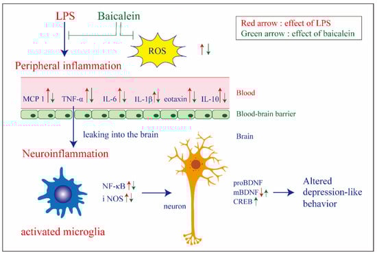 Peripherally produced pro-inflammatory cytokines can access the brain through the choroid plexus and the circumventricular organs, stimulate afferent fibers of the vagus nerve, and then transmit inflammatory signals to the brain [42]. In another study examining inflammatory injuries in mice, peripheral TNF-α could activate microglia and induce the infiltration of monocytes into the brain [43]. Activated microglia and monocytes are thought to strengthen neuroinflammatory processes in the brain [44]. Our results demonstrated that baicalein had a remarkable ability to inhibit the production of pro-inflammatory cytokines in plasma, including that of TNF-α (Figure 4); therefore, it is reasonable to speculate that baicalein might indirectly modulate neuroinflammation.