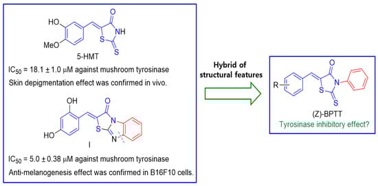 As shown in Figure 1, 5-HMT ((Z)-5-(3-hydroxy-4-methoxybenzylidene)-2-thioxothiazolidin-4-one), which possesses a β-phenyl-α,β-unsaturated carbonyl (PUSC) scaffold [,], was reported to have a lower IC50 value (18.1 ± 1.0 μM) against mushroom tyrosinase than kojic acid, a well-known natural tyrosinase inhibitor, and it had a skin-lighting effect in UVB-irradiated HRM2 hairless mice []. Compound I, ((Z)-2-(2,4-dihydroxybenzylidene)benzo[4,5]imidazo[2,1-b]thiazol-3(2H)-one), also had a low IC50 value (5.0 ± 0.38 μM) against mushroom tyrosinase and exhibited anti-tyrosinase and anti-melanogenic effects in B16F10 murine melanoma cells []. Based on the structural characteristics of these two compounds, (Z)-5-(substituted benzylidene)-3-phenyl-2-thioxothiazolidin-4-one ((Z)-BPTT) analogs were designed as a new class of tyrosinase inhibitors. Compound I had a structure that is similar to that of 5-HMT and the cleavage of the N-C bond of compound I (indicated by a broken green line in Figure 1) afforded the (Z)-BPTT analogs similar structures.