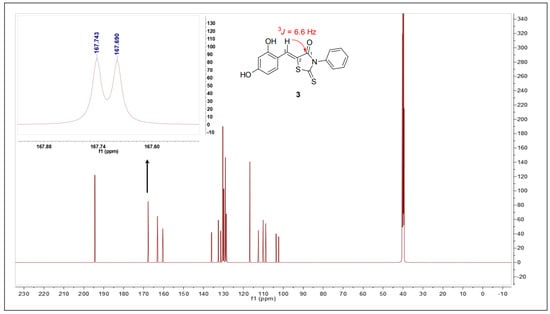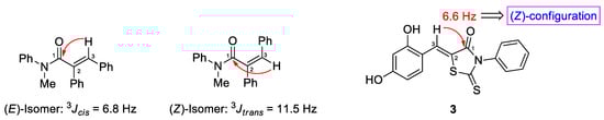 The (Z)-BPTT analogs that were examined have been previously synthesized from 3-phenyl-2-thioxothiazolidin-4-one (analog 14) with the appropriate benzaldehydes [,,] or by one-pot reactions between aniline, benzaldehyde, and C-(dithiocarboxy)formic acid []. Based on considerations of the flexibility and reaction yields, we used 13 (Z)-BPTT analogs using the former method (Scheme 1). First, analog 14 was synthesized by cyclizing phenyl isothiocyanate with thioglycolic acid in the presence of triethylamine and this was followed by Knoevenagel condensation using different benzaldehydes substituted with a bromo, hydroxyl, methoxy, or ethoxy group on the phenyl ring (Table 2 and Scheme 1). The condensation of analog 14 with these benzaldehydes in the presence of NaOAc in acetic acid gave analogs 1, 2, and 4–13 at yields of 73–90%. However, the reaction between analog 14 and 2,4-dihydroxybenzaldehyde under the same reaction conditions did not afford the desired compound, but a reaction between 2,4-dihydroxybenzaldehyde and analog 14 in the presence of a catalytic amount of 0.3 equiv of piperidine (a weak base) generated analog 3 in a 30% yield. The double bond geometries of the (Z)-BPTT analogs were assigned using 13C NMR 1H,13C coupling constants that were obtained in proton-coupled mode. Nair et al. reported that vicinal 1H,13C-coupling constants could be used in order to determine the configuration of trisubstituted exocyclic C, C-double bonds []. For example, they found that the 1H,13C-coupling constants of N-methyl-N,2,3-triphenylacrylamide depended on double bond geometry ((E)-isomer: 3Jcis (C(1), H-C(3)) = 6.8 Hz, (Z)-isomer: 3Jtrans (C(1), H-C(3)) = 11.5 Hz) (Figure 2). Furthermore, the 3Jcis values ranged from 3.6 to 7.0 Hz, whereas the 3Jtrans values were typically >10 Hz. The 13C NMR of (Z)-BPTT analog 3 was performed in proton-coupled 13C mode and the vicinal 1H,13C-coupling constant (3J(C(1), H-C(3))) of C1 was 6.6 Hz (Figure 3), which indicated that analog 3 had a (Z)-configuration.