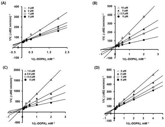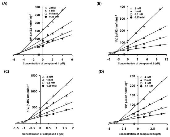The Michael constants (KM), inhibition constants (Ki), and Lineweaver–Burk and Dixon plots of the analogs were used in order to determine their modes of action [,]. In brief, 10 µL of the test analogs 1–3 and 6 (at final concentrations of 0, 1, 2, or 4 µM for analogs 1 and 6; 0, 2.5, 5, or 10 µM for analog 2; and 0, 0.4, 0.8, or 1.6 µM for analog 3) was added to a 96-well plate containing a substrate mixture (170 µL) containing an aqueous solution of l-DOPA at final concentrations of 0.5, 1, 2, 4, 8, or 16 mM, along with 14.7 mM of potassium phosphate buffer (pH 6.5) and mushroom tyrosinase solution (20 µL, 20 units). The initial rates of dopachrome production in the reaction mixtures were calculated by measuring the increases in absorbance at 492 nm (ΔOD492/min) using a microplate reader (VersaMax™, Molecular Devices, Sunnyvale, CA, USA). The maximal reaction velocity (Vmax) was determined using Lineweaver–Burk plots (plots of the inverse of the reaction rate (1/V) versus the inverse of the substrate concentration (1/[S])) that were obtained using six different l-DOPA concentrations. The mode of action of each analog was determined using the convergence point of the four plot lines.