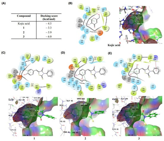 The in silico study was performed using Schrödinger Suite (2021-1) as previously described [] with slight modification. The crystal structure of mushroom tyrosinase (mTYR) (Agaricus bisporus, PDB: 2Y9X) was downloaded from the Protein Data Bank (PDB) database into Maestro 12.4 Protein Preparation Wizard. The crystal structure of mTYR was processed and the unwanted protein chains were removed. In order to optimize the structure, hydrogen atoms were added and water molecules more than 3 Å away from the enzyme were removed. The Glide grid and the active site of the enzyme was determined using the binding site of the ligand (tropolone) as described by the PDB and literature [,]. The structures of analogs 1–3 and kojic acid were imported in CDXML format from Maestro and prepared using LigPrep before ligand docking. The analogs and kojic acid were then docked to the Glide grid of mTYR using Glide from the task list []. The ligand–protein interactions and binding affinities were obtained using the Glide extra precision (XP) method [].