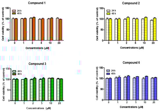 Cell viability assays on the (Z)-BPTT analogs 1–3 and 6 were performed on B16F10 melanoma cells using the EZ-Cytox assay (DoGenBio, Seoul, Korea), as previously described []. Briefly, B16F10 cells were seeded in a 96-well plate and cultured for 24 h in a humidified 5% CO2 atmosphere at 37 °C. On the following day, the cells were exposed to six concentrations (0, 1, 2, 5, 10, or 20 µM) of analogs 1–3 or 6 and then incubated in a humidified 5% CO2 atmosphere for 24 h or 48 h at 37 °C. Then, 10 µL of the EZ-Cytox solution was added to each well and the cells were incubated for 2 h at 37 °C. The absorbances were measured at 450 nm using a microplate reader (VersaMax™, Molecular Devices, Sunnyvale, CA, USA) in order to calculate the cells’ viabilities. These assays were performed independently in triplicate.