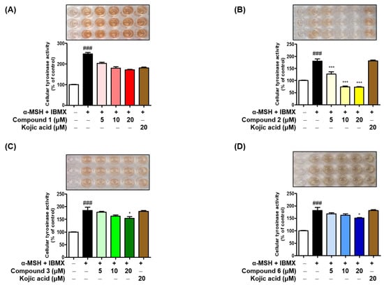 Inhibitory effect of analogs 1–3 and 6 on tyrosinase activity in B16F10 cells co-stimulated with α-MSH and IBMX. B16F10 cells were pretreated with analogs 1–3 (A–C), or 6 (D) at concentrations of 0, 5, 10, or 20 µM, or with kojic acid at 20 µM. Cellular tyrosinase activities are expressed as percentages of non-treated controls and bars represent standard errors. # and * indicate significant differences between columns: ### p < 0.001 for cells co-treated with α-MSH and IBMX versus non-treated controls; * p < 0.05, and *** p < 0.001 for cells co-treated with α-MSH and IBMX versus analogs 1, 2, 3, 6, or kojic acid pretreated and α-MSH plus IBMX co-treated cells. Three independent experiments were performed.