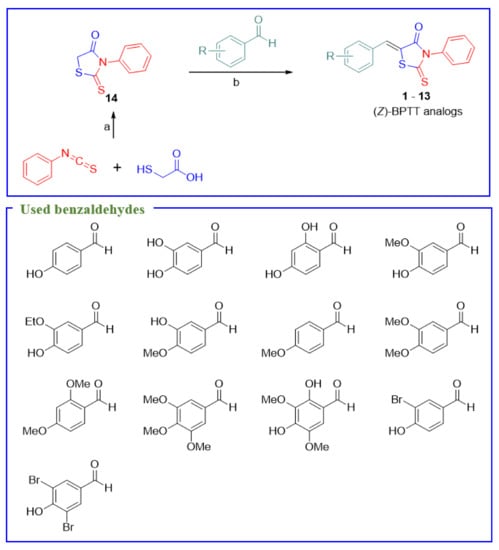 Synthetic scheme for the production of (Z)-5-(substituted benzylidene)-3-phenyl-2-thioxothiazolidin-4-one ((Z)-BPTT) analogs 1–13. Reagents and conditions: (a) Et3N, CH2Cl2, RT, 2 d, yield 41%; (b) NaOAc, CH3CO2H, reflux, 1–7 h, yield 73–90% for analogs 1–2 and 4–13, and piperidine, EtOH, reflux, 4 h, yield 30% for analog 3.