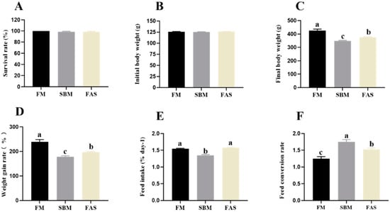 In our study, the survival rate of Japanese seabass averaged above 98.75% regardless of the experimental diets (p > 0.05, Figure 1A). Fish fed FM showed the highest growth performance, estimated as the final body weight and WG, compared to those fed soymeal-based diets (p < 0.05, Figure 1B–D), and fish fed FAS had higher growth performance than those fed SBM (p < 0.05, Figure 1B–D).