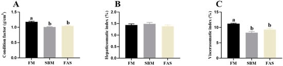 Body indexes of Japanese seabass fed diets using soybean meal as fishmeal alternative with or without functional additives. (A) Condition factor. (B) Hepaticsomatic index. (C) Viscerasomatic index. Data are presented as means ± SEM. Bars sharing the same letters are not significantly different (p > 0.05, n = 12).