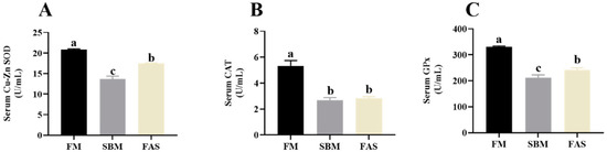 The results showed that fish fed FM revealed higher serum Cu-Zn SOD, CAT and GPx activities than those fed soymeal-based diets (p > 0.05, Figure 4). Of note, fish fed the soymeal-based diet with functional additives, i.e., the FAS group, had higher serum Cu-Zn SOD and GPx activities than those fed a similar diet without functional additives, i.e., the SBM group (p < 0.05, Figure 4A,C).