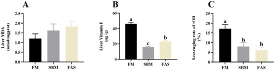 Antioxidant capacity in the liver of Japanese seabass fed diets using soybean meal as fishmeal alternative with or without functional additives. (A) Liver malondialdehyde (MDA) level. (B) Liver Vitamin E level. (C) Liver scavenging rate of hydroxyl radical (•OH). Data are presented as means ± SEM. Bars sharing the same letters are not significantly different (p > 0.05, n = 12).