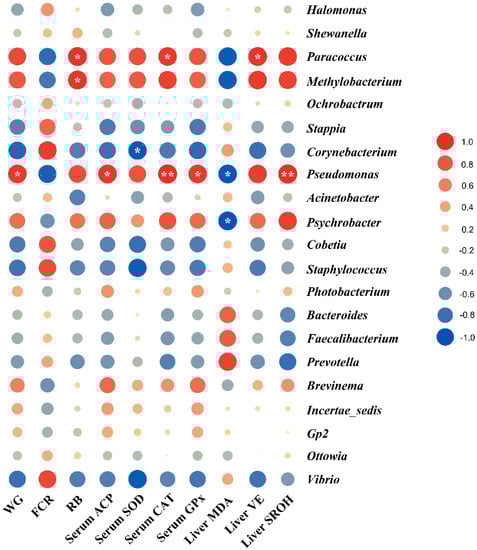 The Pearson correlation between gut microbiota and host responses. Circles in the balloon plot denoting the direction of the association are colored red (positive) or blue (negative) and are overlaid with the white symbol “*” indicating a significant correlation. Values marked with a white symbol “*” are significant correlations (p < 0.05), and “**” are very significant correlations (p < 0.01). WG: weight gain rate; FCR: feed conversion ratio; RB: respiratory burst activity; ACP: alternative complement pathway; SOD: copper-zinc superoxide dismutase; CAT: catalase; GPx: glutathione peroxidase; MDA: malondialdehyde; VE: Vitamin E; SROH: scavenging rate of hydroxyl radical.