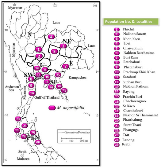 The living plant specimens were searched for and collected from natural habitats covering the entire floristic regions in Thailand such as (1) Northern (2) North-eastern (3) Eastern (4) South-western (5) Central (6) South-eastern and (7) Peninsular. The collected populations were named according to the collected provinces (Table 1). The collected specimens were identified by using the taxonomic and the species description from existing flora and previous published works [1,4,7,17,18,19], and then compared with the herbarium specimens kept in the Forest Herbarium (BKF), Kyoto University, Japan (KYO), the Prof. Kasin Suvatabandhu Herbarium, Chulalongkorn University, Bangkok, Thailand (BCU) and the Plant Varieties Protection Office, Bangkok, Thailand (BK). The herbarium abbreviations are used according to Thiers [20]. The leaves of each plant material sample were air-dried, and then prepared using the recommendations of the World Health Organization [21]. The total 25 populations of M. angustifolia (15 samples/population) collected from every floristic region throughout the country as well as the outgroup (M. hastata) shown in Table 1 were included in this study.