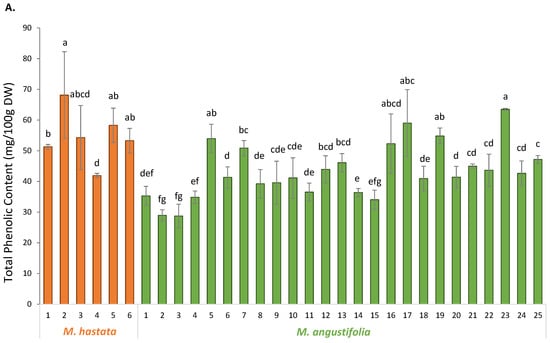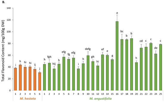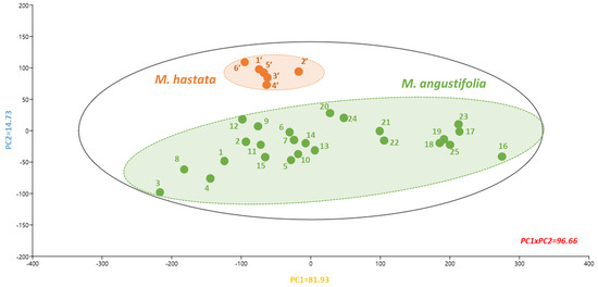 The TPC ranged from 28.78 ± 3.86 (Ma#3) to 63.49 ± 0.29 (Ma#23) mg per 100 g DW gallic acid equivalent in M. angustifolia and ranged from 41.91 ± 0.72 (Mh#4) to 68.12 ± 14.15 (Mh#2) mg per 100 g DW gallic acid equivalents in M. hastata. The TFC, ranged from 36.92 ± 4.26 (Ma#3) to 117.33 ± 11.18 (Ma#16) mg/100 g DW quercetin equivalents in M. angustifolia extracts, and from 30.68 ± 1.99 (Mh#6) to 43.68 ± 1.60 (Mh#2) mg/100 g DW quercetin equivalents in M. hastata extracts. These results revealed a significant degree of variability in both TPC and TFC for M. angustifolia as compared to M. hastata, with TFC playing a critical role in the phytochemical heterogeneity observed within the M. angustifolia populations. Noticeably, some populations of M. angustifolia appeared to be significantly richer in TFC, which might be of significant relevance given the well-known antioxidative and health-promoting effects of this class of phytochemicals [9,27]. In particular, population #16–19, #21–23 and #25 of M. angustifolia appeared of special interest because of their high TFC. Interestingly, this is the first report on the phytochemical examination of this new species. The TPC and TFC of the outgroup, M. hastata extracts, have been reported, and the published ranges of variations are in line with the present results [28,29]. It should be noted, however, that the present study is the first to evaluate TPC and TFC variabilities at the population level.