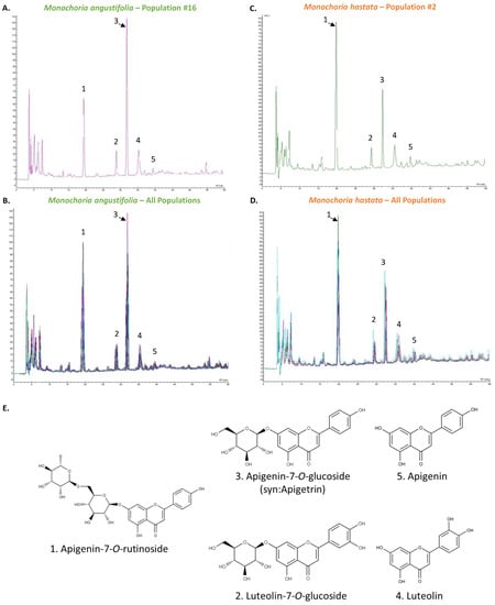 The HPLC chromatograms detected at 320 nm of (A) M. angustifolia population #16; (B) superimposed view of the M. angustifolia 25 populations; (C) M. hastata population #2; (D) superimposed view of the M. hastata 6 populations; (E) Structure of the main identified flavonoids: 1. apigenin-7-O-rutinoside; 2. luteolin-7-O-glucoside; 3. apigenin-7-O-glucoside (also known as apigetrin); 4. luteolin; 5. apigenin.