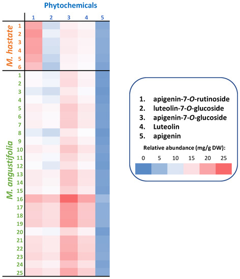 Individually, (1) apigenin-7-O-rutinoside ranged from 6.94 (Ma#3) to 22.04 (Ma#16) mg/100 g DW in M. angustifolia extracts, and from 19.78 (Mh#6) to 28.15 (Mh#2) mg/100 g DW in M. hastata extracts; (2) luteolin-7-O-glucoside ranged from 5.62 (Ma#8) to 18.91 (Ma#16) mg/100 g DW in M. angustifolia extracts, and from 3.43 (Mh#6) to 4.94 (Mh#2) mg/100 g DW in M. hastata extracts; (3) apigenin-7-O-glucoside ranged from 11.94 (Ma#3) to 36.94 (Ma#16) mg/100 g DW in M. angustifolia extracts, and from 9.63 (Mh#6) to 12.29 (Mh#2) mg/100 g DW in M. hastata extracts; (4) luteolin ranged from 7.86 (Ma#3) to 25.08 (Ma#16) mg/100 g DW in M. angustifolia extracts, and from 5.77 (Mh#6) to 7.28 (Mh#2) mg/100 g DW in M. hastata extracts; (5) apigenin ranged from 1.07 (Ma#3) to 3.41 (Ma#16) mg/100 g DW in M. angustifolia extracts, and from 1.83 (Mh#6) to 2.60 (Mh#2) mg/100 g DW in M. hastata extracts (Figure 5, Table S1). This is the first work on the HPLC analysis of the flavonoid content of M. angustifolia and, to the best of our knowledge, of M. hastata as well. However, glycoside derivatives of both apigenin and luteolin have been identified in a variety of species from the Pontederiaceae family [31,32,33], adding validity to our results. Future studies will be performed to identify other minor flavonoids using high resolution mass spectrometry. These results confirmed the different accumulation strategies observed with the TPC and TFC analyses for the two species, as well as at the population level in the case of M. angustifolia. The present results also revealed the special interest for possible applications of the new species (i.e., M. angustifolia), over M. hastata due to its higher flavonoid content. Many Monochoria species are invasive and considered weeds [34], however, this can be seen as a benefit in terms of obtaining a large and valuable biomass.