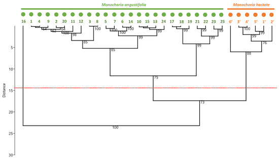 Hierarchical clustering analysis (HCA) of 25 different populations of M. angustifolia and 6 different populations of M. hastata on the basis of their phytochemical profiles. The percentages of replicate trees which associated samples cluster together in after bootstrap analysis (percentage of 5000 replicates) are shown next to the branches.