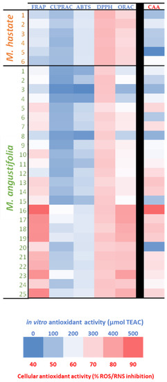 In vitro cell-free antioxidant (FRAP, CUPRAC, ABTS, DPPH and ORAC) and cellular antioxidant assay of extracts (CAA) from 25 different populations of M. angustifolia and 6 different populations of M. hastata. TEAC: TroloxC equivalent antioxidant capacity; ABTS: 2,2-azinobis (3-ethylbenzthiazoline-6-sulphonic acid); DPPH: 2,2-diphenyl-1-picrylhydrazyl; FRAP: ferric reducing antioxidant power; CUPRAC: cupric reducing antioxidant capacity; ORAC: oxygen radical absorbance capacity; CAA: cellular antioxidant assay. Means and standard deviations are provided in Table S2.