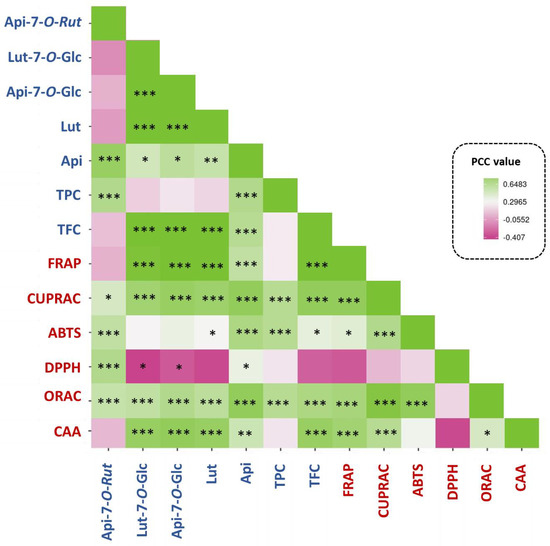 Pearson coefficient correlation (correlogram analysis) between the phytochemical profiles and antioxidant activity of extracts. Api-7-O-Rut: apigenin-7-O-rutinoside; Lut-7-O-Glc: luteolin-7-O-glucoside; Api-7-O-Glc: apigenin-7-O-glucoside (also known as apigetrin); Lut: luteolin; Api: apigenin; TPC: total phenolic content; TFC: total flavonoid content; ABTS: 2,2-azinobis (3-ethylbenzthiazoline-6-sulphonic acid); DPPH: 2,2-diphenyl-1-picrylhydrazyl; FRAP: ferric reducing antioxidant power; CUPRAC: cupric reducing antioxidant capacity; ORAC: oxygen radical absorbance capacity; CAA: cellular antioxidant assay. *** significant p < 0.001; ** significant p < 0.01; * significant p < 0.05; PCC values are indicated in Table S3.