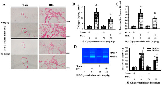 18β-Glycyrrhetinic acid alleviated BDL-induced hepatic collagen deposition in treatment study. (A) The paraffin-embedded liver tissues were subjected to Sirius Red staining. Representative photomicrographs are shown. Original magnification is 200× and 400×. (B) Collagen contents in liver tissues were measured. (C) Hydroxyproline contents in liver tissues were measured. (D) MMP-2 and MMP-9 activities of proteins isolated from liver tissues were measured using zymographic assay. Representative zymographs and the quantitative data are shown. * p < 0.05 vs. the sham vehicle group and # p < 0.05 vs. the BDL vehicle group, n = 8.