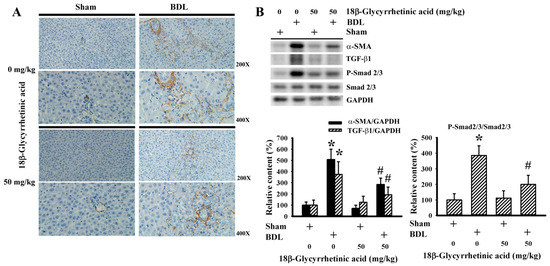 18β-Glycyrrhetinic acid alleviated BDL-induced fibrotic signaling in the treatment study. (A) The paraffin-embedded liver tissues were subjected to immunohistochemical examination with anti-α-SMA antibody. Representative photomicrographs of α-SMA immunoreactivity are shown. Original magnification is 200× and 400×. (B) Protein contents in liver tissues were measured using Western blot with indicated antibodies. Representative blots and the quantitative data are shown. * p < 0.05 vs. the sham vehicle group and # p < 0.05 vs. the BDL vehicle group, n = 8.