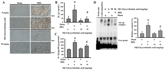 18β-Glycyrrhetinic acid alleviated BDL-induced inflammatory NF-κB in the treatment study. (A) The paraffin-embedded liver tissues were subjected to immunohistochemical examination with anti-CD68 antibody. Representative photomicrographs of CD68 immunoreactivity are shown. Original magnification is 200× and 400×. The serum samples (B) and liver tissues (C) were subjected to ELISA for the measurement of IL-1β. (D) NF-κB DNA binding activity of nuclear proteins isolated from liver tissues was measured using EMSA. Cold competition assay was conducted using nuclear proteins obtained from the BDL vehicle group. Representative blots and the quantitative data are shown. * p < 0.05 vs. the sham vehicle group and # p < 0.05 vs. the BDL vehicle group, n = 8.