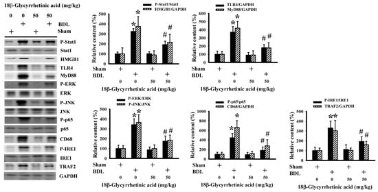 Transcription factor NF-κB governs a transcriptional program in coordinating inflammatory cell activation and cytokine expression, leading to the progression of cholestatic liver injury [43,44,45]. The results of the hepatic immunohistochemical detection of CD68 immunoreactivity (Figure 7A), hepatic protein content of CD68 (Figure 8), serum level of IL-1β (Figure 7B), hepatic level of IL-1β (Figure 7C), and hepatic NF-κB activity (Figure 7D) showed the hepatic activation of NF-κB-guided monocytes/macrophages and cytokines in BDL rats. Parallel activation was found in several intracellular signaling molecules that are important to the NF-κB-related inflammatory axis, including hepatic content of HMGB1, TLR4, MyD88, and TRAF2 protein, as well as Stat1, ERK, JNK, p65, and IRE1 protein phosphorylation (Figure 8). BDL-induced hepatic inflammatory responses were alleviated by 18β-Glycyrrhetinic acid (Figure 7 and Figure 8). The findings suggest that 18β-Glycyrrhetinic acid can alleviate BDL-induced hepatic inflammation involving the alleviation of Stat1-, HMGB1/TLR4-, Mitogen-Activated Protein Kinases (MAPKs)-, Endoplasmic Reticulum (ER) stress-, and NF-κB-related machinery.