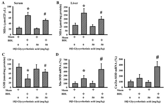 18β-Glycyrrhetinic acid alleviated BDL-induced oxidative stress in the treatment study. The serum (A) and hepatic levels (B) of MDA were measured using the TBARS assay. (C) Hepatic contents of GSH were measured. (D) Total RNAs were extracted from the obtained liver tissues and subjected to the measurement of Mn-SOD and Cu/Zn-SOD mRNA. * p < 0.05 vs. the sham vehicle group and # p < 0.05 vs. the BDL vehicle group, n = 8.