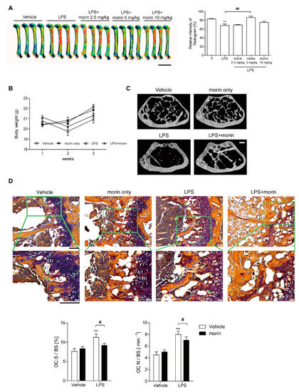 Female C57BL/6J mice (10 weeks old) were housed in the IRC’s pathogen-free animal facility. Four groups of mice were randomly separated: vehicle control (n = 4), vehicle + morin 5 mg/kg (n = 4), LPS (n = 6), and LPS + morin 5 mg/kg (n = 6). LPS (5 mg/kg, i.p.) was injected into mice in 200 μL of phosphate-buffered saline (PBS) once a week for 3 weeks [28]. Morin was solubilized with DMSO and diluted with PBS to reach 0.75% DMSO. The mice were then intraperitoneally injected every day with morin in 200 μL of PBS (or just DMSO as a vehicle control) at a 5 mg/kg dose for 3 weeks. The mice were sacrificed in a CO2 chamber at the end of the treatment period. The femur was scanned using a high-resolution Micro CT (CT) SkyScan 1176 System (Bruker-Micro CT, Kontich, Belgium) to measure bone mineral density (BMD) and microarchitecture, as described in Park et al. [9]. Commercial RatLaps EIA test kits were used to determine the serum level of collagen-type I fragments (CTX-1). Serum levels of osteocalcin, alkaline phosphatase (ALP), and hydrogen peroxide were detected by an EIA specific for mouse osteocalcin kit, colorimetric kinetic determination kit, and a colorimetric H2O2 assay kit, respectively. Sandwich ELISA using the recommended antibodies was used to assess serum MCP-1, following the manufacturer’s instructions.