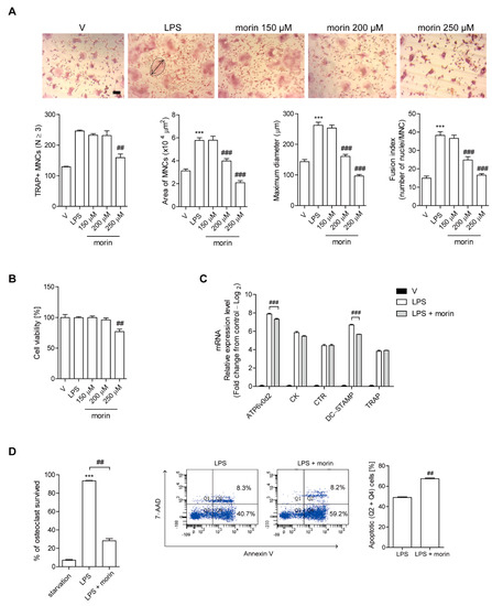 Morin reduces the number of OCs upon LPS stimulation in vitro. BMMs (104 cells/well) were cultured with M-CSF (30 ng/mL) and RANKL (40 ng/mL) for 40 h, and then incubated further for 48 h (A,B) or 24 h (C) with M-CSF (30 ng/mL) and LPS (50 ng/mL) ± morin (150 μM, 200 μM, 250 μM). LPS and morin were dissolved in PBS and methanol, respectively, as a vehicle. (A) After fixation and TRAP staining, more than 70 MNCs were selected randomly to evaluate the OC area (dotted line) and the maximum diameter (double arrow). The fusion index is presented as the average number of nuclei per TRAP-positive MNCs formed in the culture. Representative photos are shown. Scale bar: 100 μm. (B) Cell viability was performed by the MTT assay, and no obvious toxicity was found for the range of used morin concentrations compared with vehicle-treated cells. (C) The mRNA expression of OC-specific genes in LPS-stimulated cells in the presence or absence of morin (200 μM) was analyzed by qPCR. Gene expression was visualized as the mean fold change of mRNA levels relative to RANKL pre-treatment samples (log2 scale). (D) Mature OCs were stimulated with LPS (50 ng/mL) with or without morin (200 μM) in the presence of M-CSF (30 ng/mL) for 6 h to measure TRAP-positive MNCs and annexin V-positive cells to evaluate OC survival. *** p < 0.001 compared with PBS-treated pre-OCs. ## p < 0.01, ### p < 0.001 compared with LPS-treated cells. Similar results were obtained from three independent experiments.