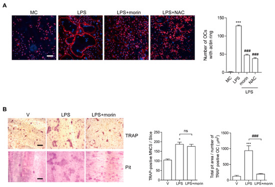 Morin inhibits LPS-stimulated actin ring formation and OC activity. BMMs were cultured with M-CSF (30 ng/mL) and RANKL (40 ng/mL) for 96 h. (A) Cells were incubated with α-MEM/10% FBS (medium control, MC) or with LPS (50 ng/mL) ± morin (200 μM) or NAC (3 mM) in the presence of M-CSF as indicated. After 6 h of incubation, the cells were stained with rhodamine phalloidin (red color) and Hoechst (blue color) to visualize actin rings and nuclei, respectively. Representative images are shown. Scale bar: 100 μm. The number of OCs with actin rings was plotted for the indicated conditions. (B) Mature OCs were seeded on dentine slices with M-CSF and LPS ± morin (200 μM) for 4 days. Cells were stained for TRAP to measure the number. After cells were removed, slices were stained for toluidine blue to calculate the resorption pits. Representative photos of TRAP-positive OCs and resorption pits are shown. Scale bar: 100 μm. The total pit area/number of TRAP-positive OCs was calculated. * p < 0.05, *** p < 0.001 compared with MC or vehicle; ### p < 0.001 compared with LPS. Similar results were obtained in three independent experiments.