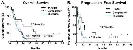 Survival analysis from phase I trial (NCT01852890). (A) Kaplan–Meier curve estimating median overall survival in subjects treated with P-AscH– plus gemcitabine and radiation therapy as of 25 January 2022 (n = 14) was 22.8 months vs. 12.7 months in institutional controls treated with gemcitabine and radiation therapy (n = 19, Log-Rank test p = 0.02); (B) Kaplan–Meier curve demonstrating median progression-free survival in subjects treated with P-AscH– plus gemcitabine and radiation therapy as of 25 January 2022 (n = 14) was 13.7 months vs. 4.6 months in institutional controls treated with gemcitabine and radiation therapy (n = 19, Log-Rank test p = 0.01). These data are updated from data previously published by Du et al. [60].