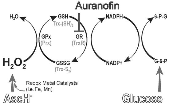 Over the past few decades, significant interest in the anticancer effects of Au has arisen. The key mechanism of action thought to be responsible for the anticancer effects of Au is thioredoxin reductase inhibition (Figure 2) [92,93]. Au serves as an electrophile and reacts with the selenocysteine residue in the active site of thioredoxin reductase by forming a covalent adduct and inactivating the enzyme [73]. Inhibition of thioredoxin reductase inhibits the flow of electrons from NADPH to peroxiredoxin by impairing the recycling of thioredoxin, leading to a subsequent reduction in peroxiredoxin activity and an increase in H2O2 [94]. Increasing H2O2 via this mechanism may lead to additional cancer-specific cytotoxicity, as discussed previously [31,95]. Several in vitro studies have demonstrated a synergistic induction of apoptosis when Au is given in combination with various chemotherapy agents in breast cancer cell models [96,97,98]. In one study, Lee et al. demonstrated that the combination of Au and mesupron, a urokinase-type plasminogen activator inhibitor currently undergoing clinical trials in breast cancer, promoted the inhibition of breast cancer cell proliferation and induced cell cycle arrest and apoptosis, while also significantly increasing reactive oxygen species within cancer cells [97]. Similar studies in colon, ovarian, and lung cancer cell lines demonstrating synergistic increases in cancer cell death show that Au may be an effective anticancer agent when combined with other chemotherapy agents [99,100,101]. Based on these findings, a previous study hypothesized that Au may sensitize cancer cells to P-AscH− by impairing hydroperoxide removal [102]. To test this, pancreatic ductal adenocarcinoma cancer cells were treated with inhibitors of hydroperoxide metabolism. Data show that targeting of the thioredoxin system with Au inhibits thioredoxin reductase activity and sensitizes pancreatic cancer cells to P-AscH−-generated H2O2. The combination of Au and P-AscH− also significantly increases the sensitivity of pancreatic cancer cells to ionizing radiation. Based on these results, repurposing Au in combination with P-AscH− as a chemotherapy and radiomodulatory regimen may provide a potentially promising and translatable new treatment for pancreatic cancer. For all experiments, Au was dissolved in PBS containing 1% EtOH.