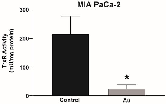 Au inhibits thioredoxin reductase activity in pancreatic cancer cells. MIA PaCa-2 cells were incubated with 1 µM Au for 3 h prior to measuring thioredoxin reductase activity. Au significantly reduced thioredoxin reductase activity compared to control. Data represent thioredoxin reductase activity in mU/mg protein ± SE (* p < 0.05; two-tailed unpaired Student’s t test). Reprinted/adapted with permission from [102,103]. Copyright 2017 Elsevier.