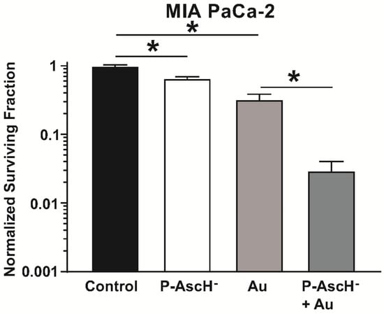 Au sensitizes pancreatic cancer cells to P-AscH−. Clonogenic cell survival of MIA PaCa-2 cells incubated with Au (1 µM for 3 h) followed by 2 mM P-AscH− (1 h) was significantly decreased compared to control and to either treatment alone. Treatment with either Au or P-AscH− also decreased clonogenic survival compared to control. Data represent normalized surviving fractions compared to control ± SE (* p < 0.01; one-way ANOVA with Tukey’s multiple comparisons). Reprinted/adapted with permission from [102,103]. Copyright 2017 Elsevier.