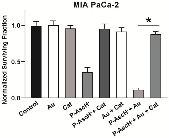 Catalase reverses killing induced by the combination of Au and P-AscH−. MIA PaCa-2 cells were evaluated for clonogenic cell survival after treatment with either catalase (Cat, 100 U/mL, 1 h), Au (500 nM, 24 h), and/or P-AscH− (1 mM, 1 h). The combination of P-AscH− and Au significantly decreased clonogenic cell survival compared to P-AscH−, and the addition of catalase completely reversed the decrease. Data represent normalized surviving fractions compared to controls ± SE (* p < 0.05; one-way ANOVA with Tukey’s multiple comparisons). Reprinted/adapted with permission from [102,103]. Copyright 2017 Elsevier.