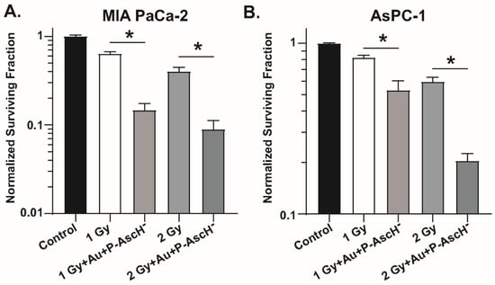 Au + P-AscH− radiosensitizes pancreatic cancer cell lines. (A) MIA PaCa-2 and (B) AsPC-1 cells were evaluated for clonogenic survival after treatment with either irradiation alone (1–2 Gy) or in combination with Au (500 nM, 24 h), P-AscH− (1–2 mM, 1 h), and irradiation (1–2 Gy). The combination of Auranofin and P-AscH− significantly reduced clonogenic cell survival of MIA PaCa-2 and AsPC-1 cells at both 1 and 2 Gy. Data represent normalized surviving fractions compared to controls ± SE (* p < 0.05; two-tailed unpaired Student’s t test). Reprinted/adapted with permission from [102,103]. Copyright 2017 Elsevier.