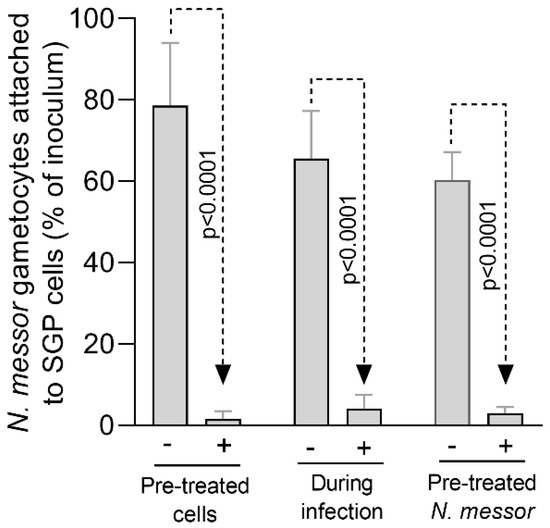 Following the identification of the Aq sublethal concentration (0.5%) we have next investigated its effect in preventing the adhesion of N. messor to SGP cells. Pre-treatment of SGP cells with 0.5% Aq prior to infection, the presence of Aq during infection, or the pre-treatment of gametocytes prior to infection with 0.5% Aq significantly reduced (p < 0.0001) the number of N. messor gametocytes (Figure 2) attached to SGP cells. The dual infection inhibitor effect of Aq, on both the parasite and the host, suggested the need for further investigations to unlock the nature of its effect.