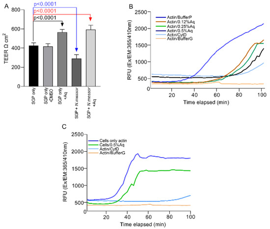 To understand the precise role of Aq, we next investigated its involvement in restoring TEER and preventing cellular actin polymerization during N. messor infection of SGP cells. Our results show that tight junction resistance (TEER) is restored in the presence of 0.5% Aq (Figure 3). At 24 h post-infection, the TEER of infected and Aq treated SGP cells increased significantly (p < 0.0001) compared to the untreated infected cells where a significant decrease was observed (p < 0.0001) (Figure 3). To further investigate the mechanism involved in reduced parasite adhesion, we further tested the ability of Aq to prevent cellular actin polymerization in vitro. Results confirmed that the highest inhibition of actin polymerization was achieved at concentrations of 0.5% Aq (Figure 3B). In a separate experiment analyzing the effect of Aq on SGP cellular actin, we observed inhibition of actin polymerization over time (Figure 3C). These results indicate that the antimicrobial mixture inhibits the disruption of the cellular tight junctions and prevents actin polymerization resulting in reduced N. messor attachment to SGP cells.
