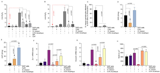 The effect of Aq on N. messor infected SGP cell membrane integrity. Panel (A) shows the H2O2 levels in N. messor infected SGP cells in the presence of Aq, and Panel (B) shows the impact of the impact of CytD cytoskeleton inhibitor. The impact on N. messor adhesion to SGP cells is presented in Panel (C). Panel (D) presents the SOD activity, and (E) presents the catalase (CAT) in Aq-treated infected cells. Zo-1 and occluding mRNA levels are shown in Panels (F,G), respectively, followed by the TEER values in Panel (H). Data are presented as means (SD) of three independent experiments. p values are indicated on graph to indicate significance.