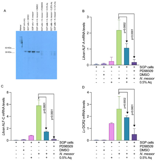 The effect of Aq on ERK tyrosine phosphorylation (Panel A) and the Litvan ALF-A (B), Litvan ALF-A (C), and Lv DCR2 (D) mRNA levels in N. messor infected SGP cells. P-Tyr levels were assessed in infected SGP cells in the presence of 0.5% Aq and of the ERK inhibitor, PD98509. Experiments were performed in triplicates. P values are indicated on graph to indicate significance.