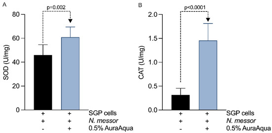 We have next attempted to translate in vivo the observed in vitro antioxidant effects of Aq. To gain in vivo relevance, we have performed challenge studies by infecting P. vannamei shrimps with N. messor with or without Aq treatment. The results presented in Table 2 show that 0.5% Aq reduced to 14% the mortality rates in infected shrimp (Table 2) from a rate of 68% recorded in the infected and untreated control group compared to after 24 h of exposure. The activity of SOD (Figure 6A) was significantly increased (p = 0.002) in the gut tissue of the infected and treated group. Catalase followed a similar trend (Figure 6B) of increased activity (p < 0.0001) in the infected and treated group and was maintained to significantly lower levels in the control group. The challenge tests further confirmed the in vitro antioxidant effect of Aq and recommends its use in shrimp farming to prevent parasitic infections.