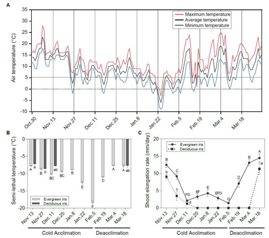 Freezing tolerance and vegetative growth status of leaves in evergreen and deciduous irises under natural cold acclimation and deacclimation. (A) Changes in air temperature from 30 October to 21 March 2021 in the field. The maximum temperature, average temperature and minimum temperature are indicated by red, black and blue lines, respectively. (B) Changes in semi-lethal temperature (LT50) for functional leaves in evergreen and deciduous irises. (C) Alterations in the shoot elongation rate in evergreen and deciduous irises. Cold acclimation process, sampling from 13 November to 5 February 2021; deacclimation process, sampling from 19 February to 18 March 2021. The data are the means of three biological replicates, with different letters indicating significant differences between treatments according to Duncan’s multiple range test at p < 0.05. No functional leaves could be sampled from 25 December to 4 March 2021 in deciduous irises. Capital and lowercase letters represent significant differences for relevant parameters within evergreen and deciduous irises (p < 0.05), respectively.