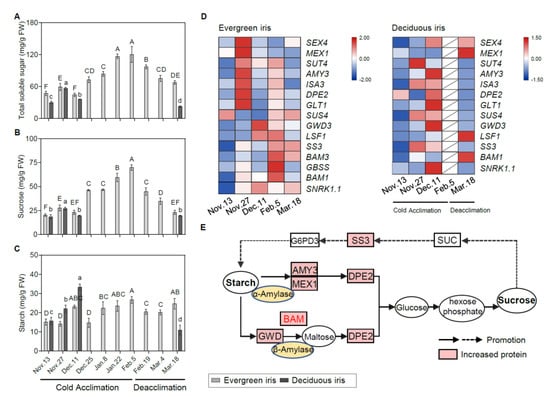 Physiological and molecular analyses of carbohydrates in the functional leaves of evergreen and deciduous irises under natural cold acclimation and deacclimation. (A–C) Changes in carbohydrate concentrations for functional leaves in evergreen and deciduous irises. For deciduous irises, no functional leaves could be sampled from 25 December to 4 March 2021. Cold acclimation process, sampling from 13 November to 5 February 2021; deacclimation process, sampling from 19 February to 18 March 2021. The data are the means of three biological replicates, with different letters indicating significant differences between treatments according to Duncan’s multiple range test at p < 0.05. The push pin represents standard error. Capital and lowercase letters represent significant differences for relevant parameters within evergreen and deciduous irises (p < 0.05), respectively. (D) Expression levels of sugar-metabolism-related genes expressed in evergreen and deciduous irises. Different colors indicate different levels of gene expression by quantitative real-time PCR; the data in each row were normalized and compared separately; blue indicates downregulation, and red indicates upregulation. Gene names are shown in Table S2. (E) A schematic illustration of sugar metabolism in evergreen and deciduous irises in this study.
