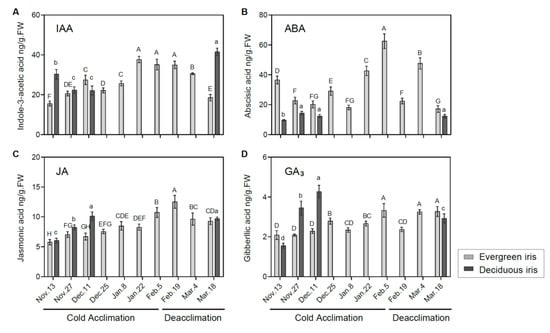 Measurements of endogenous phytohormones in the functional leaves of evergreen and deciduous irises under natural cold acclimation and deacclimation. Levels of (A) IAA, (B) ABA, (C) JA and (D) GA3. Cold acclimation process, sampling from 13 November to 5 February 2021; deacclimation process, sampling from 19 February to 18 March 2021. Values are the means of three biological replicates, and bars represent the standard error. Different letters indicate significant differences according to Duncan’s multiple range test at p < 0.05. Capital and lowercase letters represent significant differences for relevant parameters within evergreen and deciduous irises (p < 0.05), respectively.