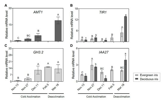 Expression changes of auxin-related genes in functional leaves of evergreen and/or deciduous irises under natural cold acclimation and deacclimation. (A) Expression levels of AMT1 for deciduous iris. (B) Expression levels of TIR1 for two iris species. (C) Expression levels of GH3.2 for evergreen iris. (D) Expression levels of IAA27 for two iris species. Cold acclimation process, sampling from 13 November to 5 February 2021; deacclimation process, sampling from 19 February to 18 March 2021. Values are the means of three biological replicates, and bars represent standard error. Different letters indicate significant differences according to Duncan’s multiple range test at p < 0.05. Capital and lowercase letters represent significant differences for relevant parameters within evergreen and deciduous irises (p < 0.05), respectively. Gene names are shown in Table S2.