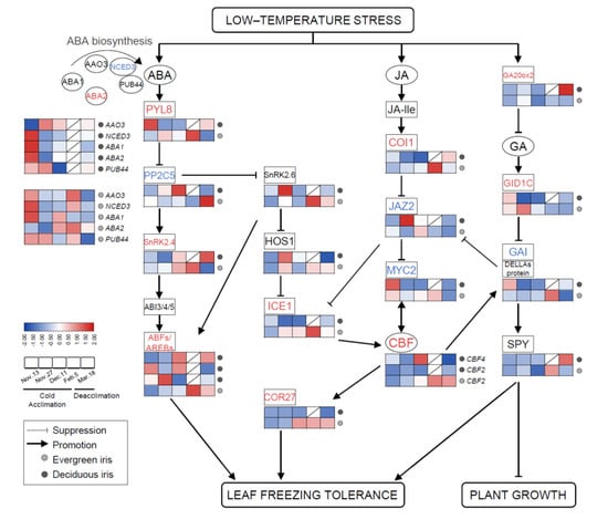 In contrast with JA, cold stress accelerates the degradation of GA and leads to growth restrictions [18]. The GA pathway interacts with JA signaling and CBF-dependent CA [79]. In this pathway, the DELLA protein is encoded by GAI-mediated growth restriction under cold stress. In Pyrus ussuriensis, GAI was rapidly upregulated after 12 h cold treatment [80]. Similarly, GAI levels in the deciduous and evergreen irises were upregulated on 13 November and 5 February 2021 during CA, respectively. However, the GA3 level accumulated, whereas growth was restricted in both iris species during CA (Figure 4D), which suggested that the effect of GA3 on plant growth seems to be complicated under cold stress.