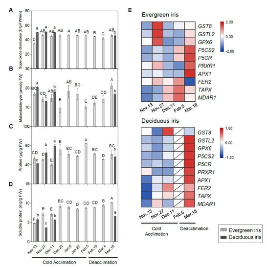 Changes in stress-related indices in the functional leaves of evergreen and deciduous irises and the expression of stress-related genes. Changes in the activities of (A) superoxide dismutase, (B) malondialdehyde, (C) proline and (D) soluble protein in the leaves of both species under natural cold acclimation and deacclimation. Cold acclimation process, sampling from 13 November to 5 February 2021; deacclimation process, sampling from 19 February to 18 March 2021. For the deciduous iris, no functional leaves could be sampled from 25 December to 4 March 2021. The data are the means of three biological replicates, with different letters indicating significant differences between treatments according to Duncan’s multiple range test at p < 0.05. The push pin represents the standard error. Capital and lowercase letters represent significant differences for relevant parameters within evergreen and deciduous irises, respectively (p < 0.05). (E) Expression levels of stress-related genes in evergreen and deciduous irises. Gene names are presented in Table S2.