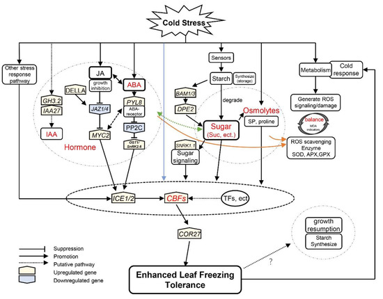 Transcription factors cascade which in response to freezing stress during the process of CA have been studied intensively. It could regulate the expression of CORs encoding cryoprotective proteins which protects plant cells against cold-induced damage [2]. Of these reported cascades, the ICE–CBF/DREB–COR pathway plays a central role during CA [7,8]. C-repeat binding factors (CBFs) might integrate stress-responsive substrates; subsequently, sugars and phytohormones interact and synergistically facilitate improvements in freezing tolerance in plants by directly or indirectly participating in the ICE–CBF–COR cascade [9,10]. Accumulating evidence has revealed that the degradation of starch and accumulation of soluble sugars, especially sucrose, help to enhance freezing tolerance during CA [11]. Genes encoding beta-amylase (BAM, a key enzyme in starch degradation) have been identified as CBF regulons and work during CA by regulating sugar concentrations [12]. In addition, studies have suggested that sugars acting as signaling molecules can trigger abscisic acid (ABA) and other stress-responsive factors (such as antioxidant reaction) to withstand cold conditions [13].