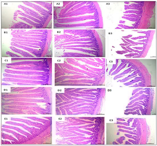 Representative photomicrograph of H&E-stained small intestine sections of broiler chickens in 40× magnification. Duodenal sections from SPC0 showed normal intestinal villi with a free lumen (A1); those from SPC0.25 group showed a mild increase in villus height (B1); sections from SPC0.5–1 groups revealed markedly thin, tall, and separate villi with mild goblet cell proliferation, increased sizes, and rows of enterocytes with arranged lamina propria (C1,D1,E1). Jejunal segment sections of SPC0 showed free lumina with nearly normal villus structures (A2), while sections from the SPC0.25 group showed a small increase in villi length (B2). Jejunum segments from SPC0.5−1 groups showed closely packed villi with a marked increase in their length and markedly serrated surfaces with goblet cell metaplasia (C2,D2,E2). Ileal segment sections from basal treatment showed tongue-shaped villi with a different height (A3); sections from the SPC0.25 group exhibited normal histology (B3); the sections from the SPC0.5 and SPC0.075 groups showed relatively increased villus height (C3,D3); those from the SPC1 diet group showed normal villi (E3).