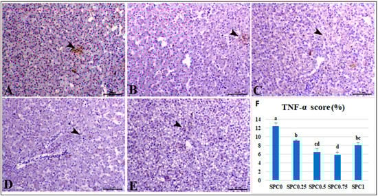 Photomicrograph of hepatic tissues immunostained with TNF-α antibody. The liver of the control SPC0 group showed mild expression of TNF-α within a few hepatocytes (A) (arrowhead). The liver of the SPC0.25 group showed scanty expression of TNF-α within hepatocytes (B) (arrowheads). The liver of the SPC0.5 group showed a marked decrease in immunostaining of TNF-α within hepatic tissues (C) (arrowhead). The liver of the SPC0.75 showed a significant decrease in the expression of TNF-α within the blood sinusoids (D) (arrowhead). The liver of SPC1 showed a marked decrease in the expression of TNF-α within hepatocytes (E) (arrowhead). Bar = 50 µm. (F) shows morphometric measures of TNF-α immunostaining expression (%). a,b,c,d Means carrying different superscripts were significantly different (p ≤ 0.05).