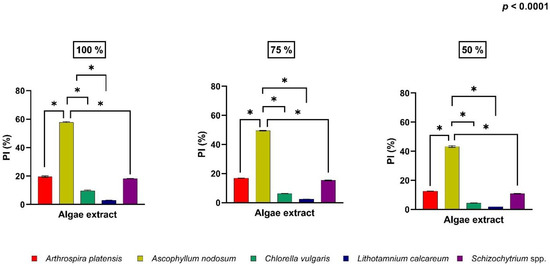 Percentage of inhibition (PI%) of radical scavenging activity at three different concentrations (100%; 75%; 50%) of four algal and cynobacterial extracts tested (Arthrospira platensis; Ascophyllum nodosum; Chlorella vulgaris; Lithothamnium calcareum and Schizochytrium spp.). Data are shown as means and standard deviations. * Asterisk indicates statistically significant differences among tested compounds (Treatment p < 0.0001).