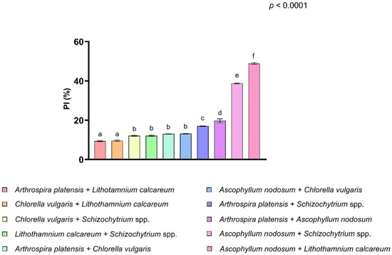 Also, the synergistic or combined effect of antioxidant activity was evaluated. The data obtained showed that above all the possible combinations listed in Table S2, the ones that showed the highest antioxidant capacity were Ascophyllum nodosum and Lithothamnium calcareum (Figure 2). This combination displayed the highest antioxidant effect with a PI of 48.84 ± 1.37%, thus suggesting a combined effect for the combination of algal species. In fact, the sum of individual activities was lower than the activity of the combined extract (45.10 ± 1.74% and 48.84 ± 1.37%, respectively). Additionally, the combination of Chlorella vulgaris and Lithothamnium calcareum showed a combined effect, in which the activity of the combined extract was higher than the sum of the individual activities (9.59 ± 1.10% and 6.27 ± 0.24%, respectively). For the other combinations, the obtained data showed an antioxidant effect lower than that exerted by the single algae or cyanobacteria (p < 0.0001) (Table S2).